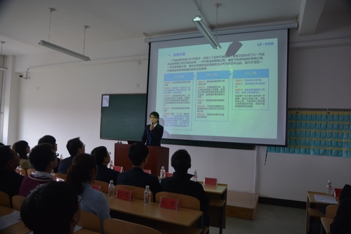 张香秋同志代表一汽金融鑫安公司,对学校人才培养方式表示充分肯定,并从企业角度对合作项目进行了客观全面的宣讲。从职能部门到员工活动、从职业标准到福利待遇,点点滴滴,描绘出公司和谐向上的整体形象。