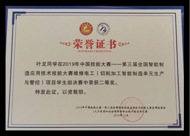 近日,第21届"全国青年岗位能手"名单公布,我校学生叶龙光荣上榜。据悉,"全国青年岗位能手"是全国各行各业先进青年的典型代表,集中展现了新时代中国青年不懈奋斗、永久奋斗的精神风貌,为广大青年立起了标杆、作出了榜样。