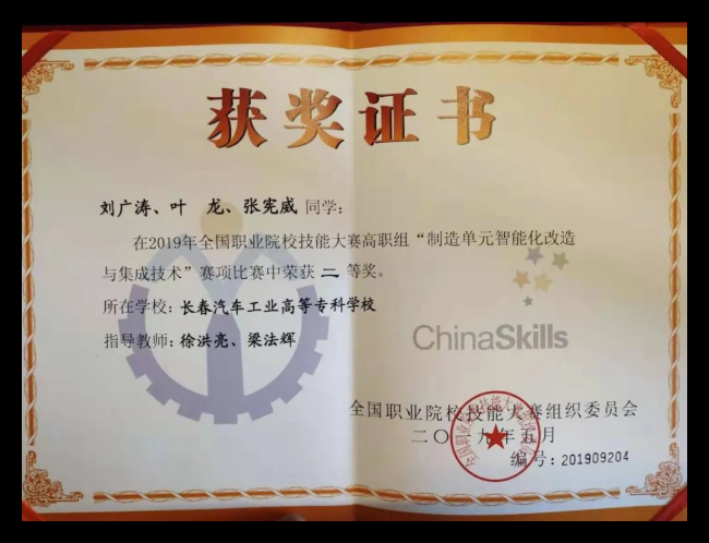 2018年,叶龙进入我校工业机器人技术专业学习。他在课堂上认真听讲,课后刻苦钻研,在不断比赛的循环往复中,渐渐收获了很多同龄学生没有的经验和教训。叶龙认为,和正常的课堂知识学习相比,备赛训练确实辛苦,但是在收获的那一刻,备赛过程中流下的汗水和泪水都变的熠熠生辉。通过魔鬼式训练和比赛,真正的将课堂所学变为自己所用,知识获得了延伸和拓展,日后才能变成企业所需。在实训室的叶龙褪去了青涩,技术技能和心理抗压能力都有了显著增强,对比赛时间和得分点的把控也游刃有余,在校期间多次参加大赛并屡获佳绩。2018年12月获得了吉林省高职院校技能大赛制造单元智能化改造与集成技术赛项一等奖,时隔四日后,又代表学校参加吉林省高职院校机电一体化赛项,荣获获省一等奖。2019年5月代表吉林省参加全国职业院校技能大赛制造单元智能化改造与集成赛项,荣获国家二等奖。2019年9月荣获吉利工业机器人大赛二等奖。2019年11月荣获第三届全国职业院校技能大赛智能制造应用技术赛项二等奖。紧接着的12月,参加2020吉林省高职院校技能大赛制造单元智能化改造与集成技术赛项获得二等奖,机器人技术应用赛项荣获一等奖。2021年参加全国职业院校技能大赛机电一体化赛项获得三等奖。