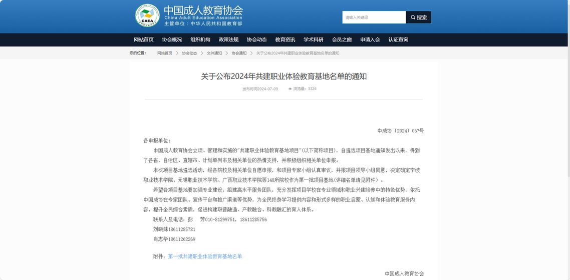 近日,中国成人教育协会公布了第一批“共建职业体验教育基地”名单,我校成功入选。