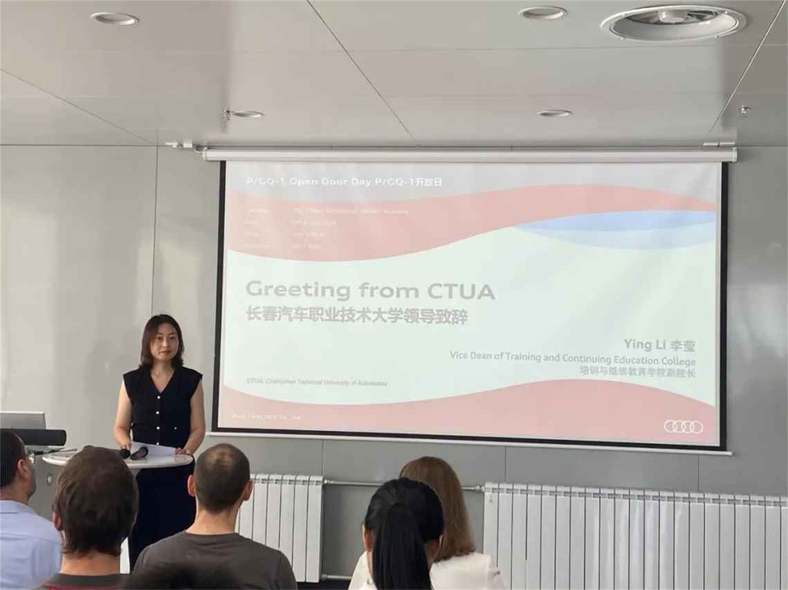 8月9日,奥迪一汽新能源汽车有限公司(以下简称奥迪一汽)质量部开放日主题活动在奥迪一汽培训中心举行,奥迪一汽人力与组织领域经管会成员Marie女士,奥迪一汽企业质量总监Christian先生及我校培训与继续教育学院副院长高一强、李莹出席仪式。仪式由Christian先生主持。