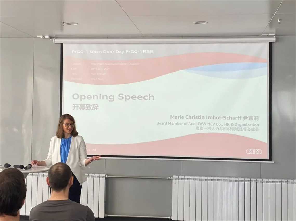 会上,Marie女士对长汽大学的到来表示热烈欢迎,并向大家介绍了奥迪一汽新能源自建厂以来取得的工作成效及下一步工作计划。Marie表示,2022年10月以来,校企双方积极推进战略合作,切实为企业解决了建厂初期阶段人员需求和能力提升的问题,助力奥迪一汽PPE项目早日引领中国高端汽车市场。