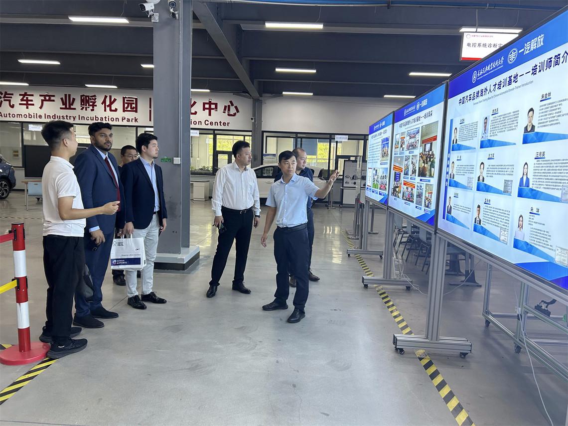 我校汽车运用学院副院长田丰福、汽车动力技术教研室主任石庆国、教师崔艳宇陪同参观,并向代表团一行介绍了一汽海外培训基地的培训资源和建设成果。双方就下一步开展沙特等“一带一路”国家的汽车售后服务培训进行了洽谈并达成共识。