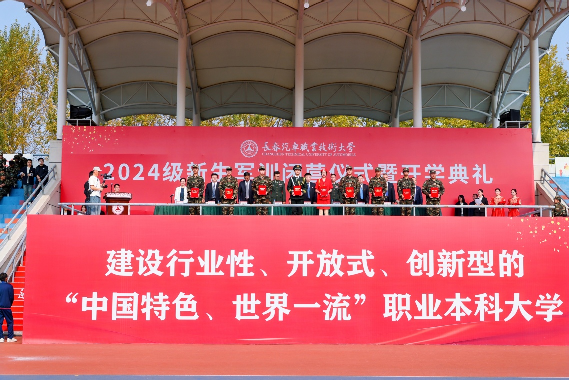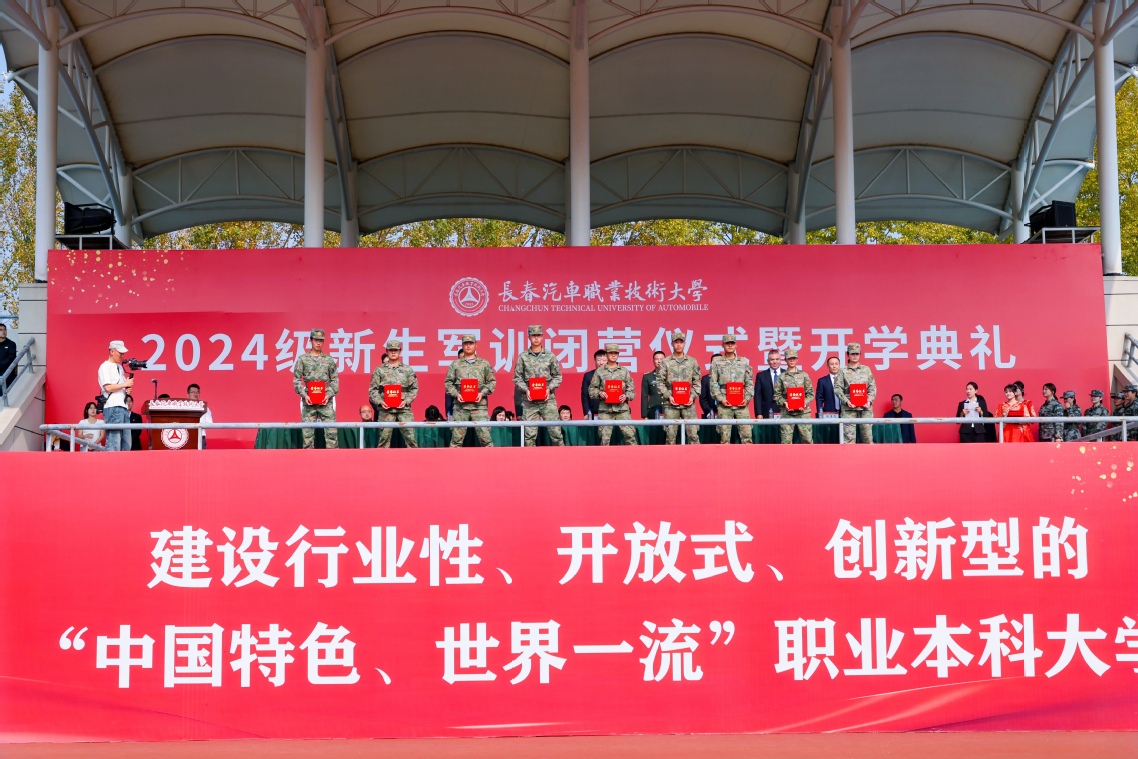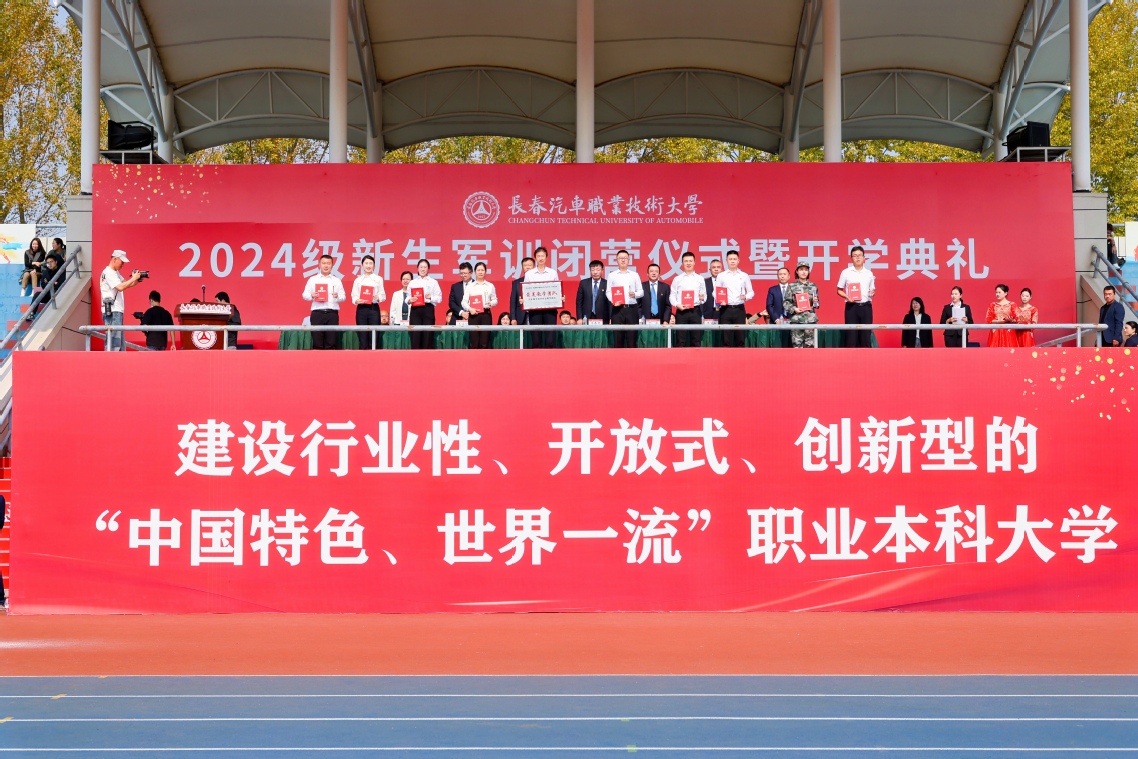 副校长丁卓宣读《长春汽车职业技术大学关于表彰2024级新生军训工作先进集体和个人的决定》,军训优秀方队、军事训练标兵、优秀军训教官、优秀带训辅导员等获奖代表先后上台领奖。副校长郑柏迎宣读《长春汽车职业技术大学关于表彰2024年度“最美教师暨黄大年式好老师”和“最美教学团队”的决定》,获奖教师代表上台领奖。副校长张勇忠宣读《长春汽车职业技术大学关于表彰2023—2024学年度优秀教学团队、优秀教师、优秀教育工作者、师德标兵、优秀兼职教师、优秀辅导员以及标兵辅导员的决定》,获奖教师代表先后上台领奖。
