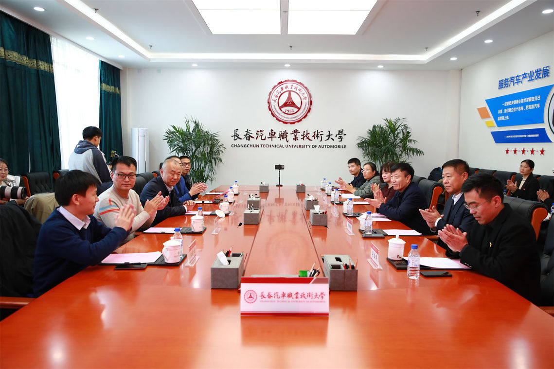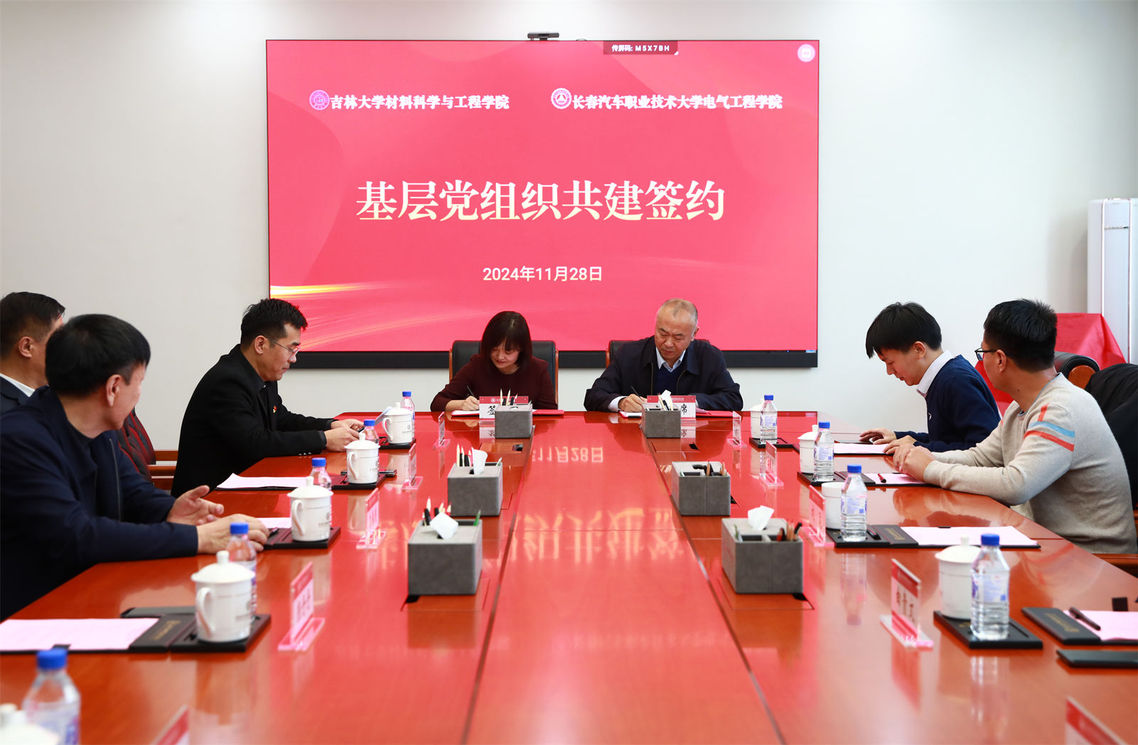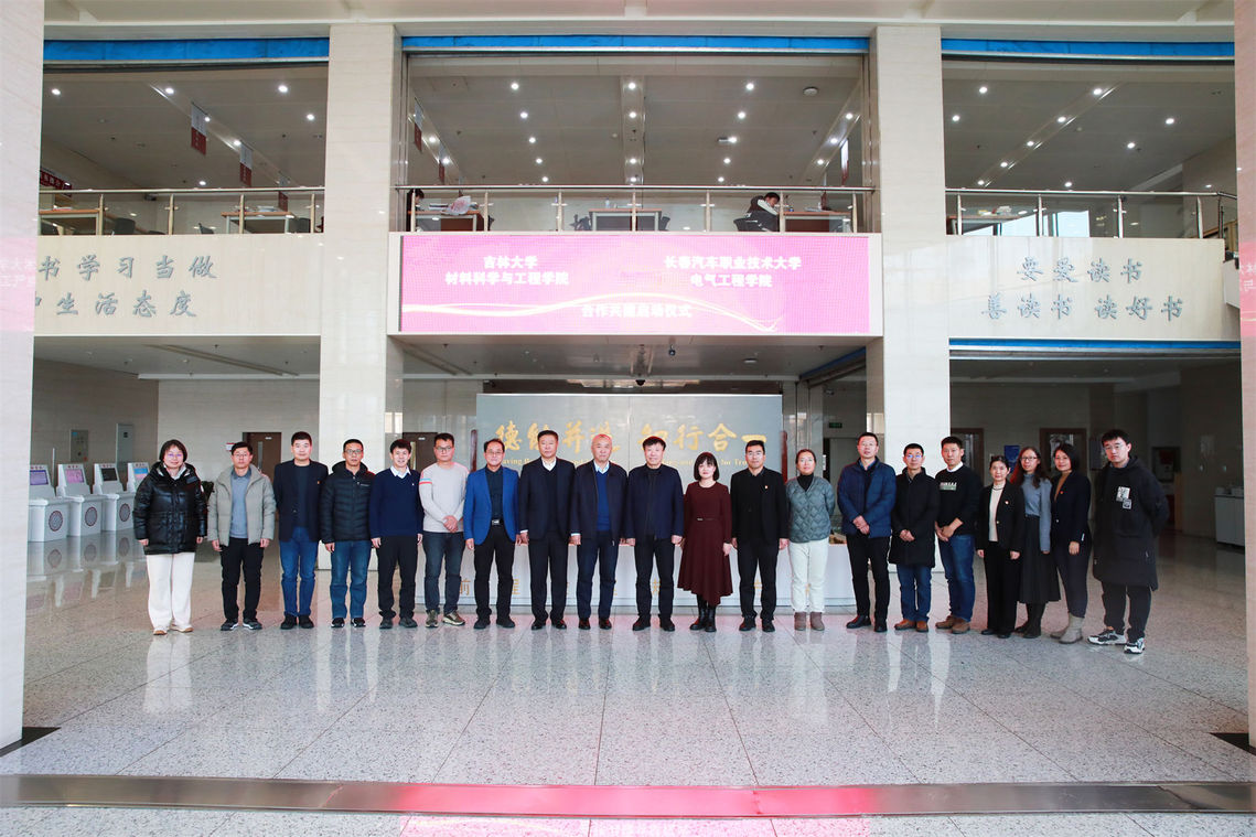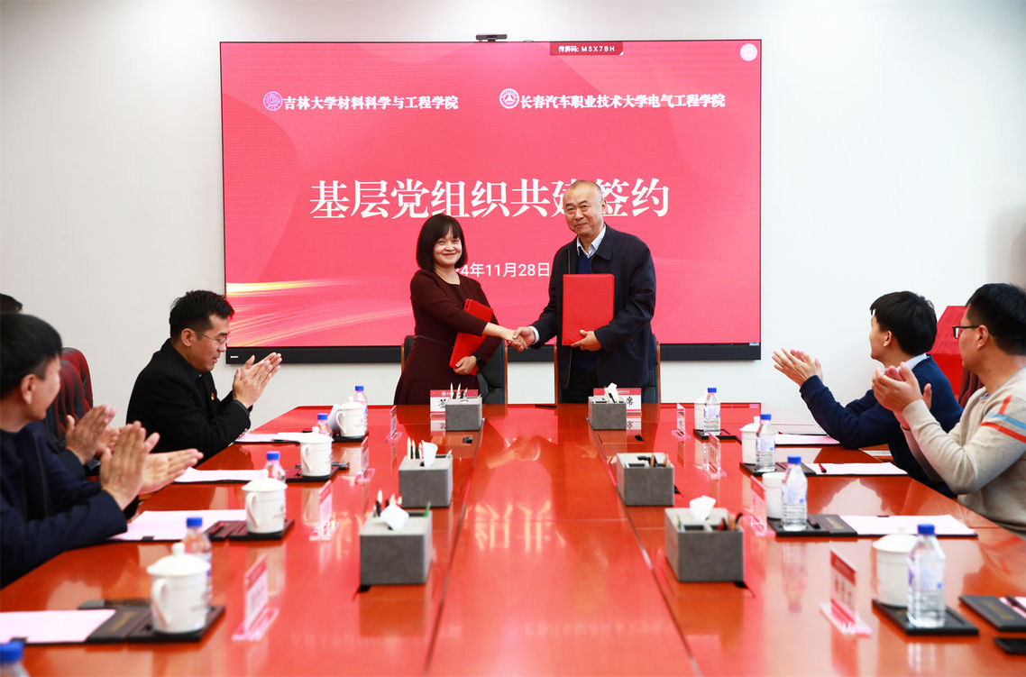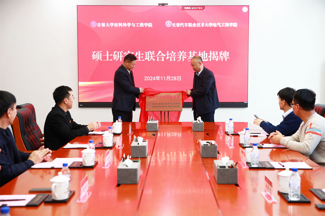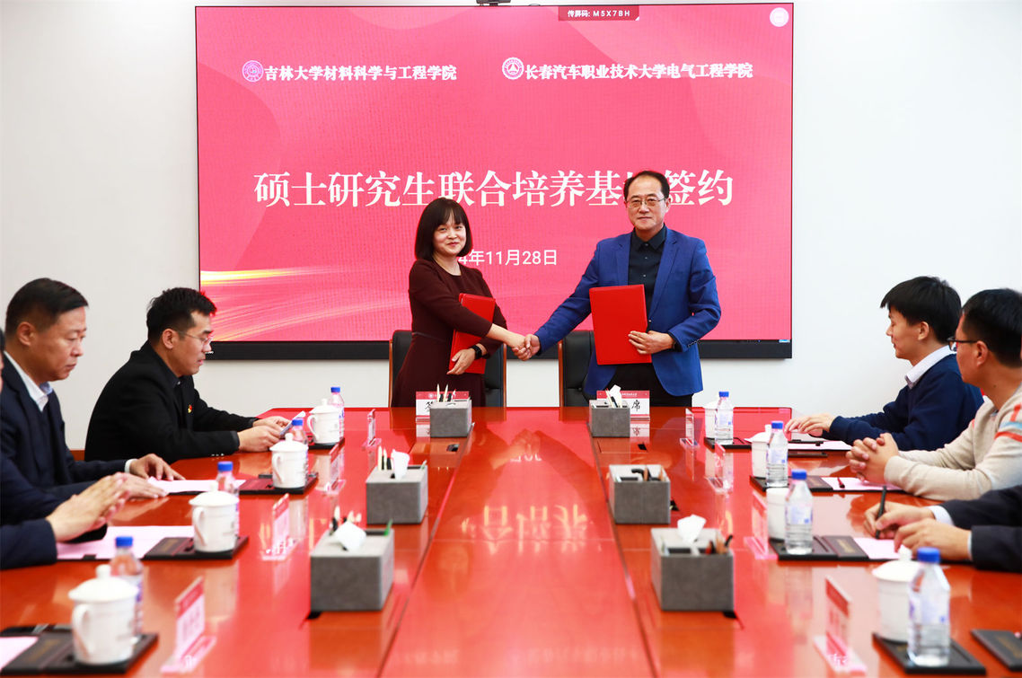 曲贵文、颜丹丹郑重签署了共建硕士研究生联合培养基地协议。未来,双方将本着相互支持、合作共赢的原则,共建“吉林大学材料科学与工程学院-长春汽车职业技术大学电气工程学院材料类专业学位硕士研究生联合培养基地”,并在联合指导、科学研究等方面达成了共识。