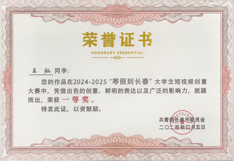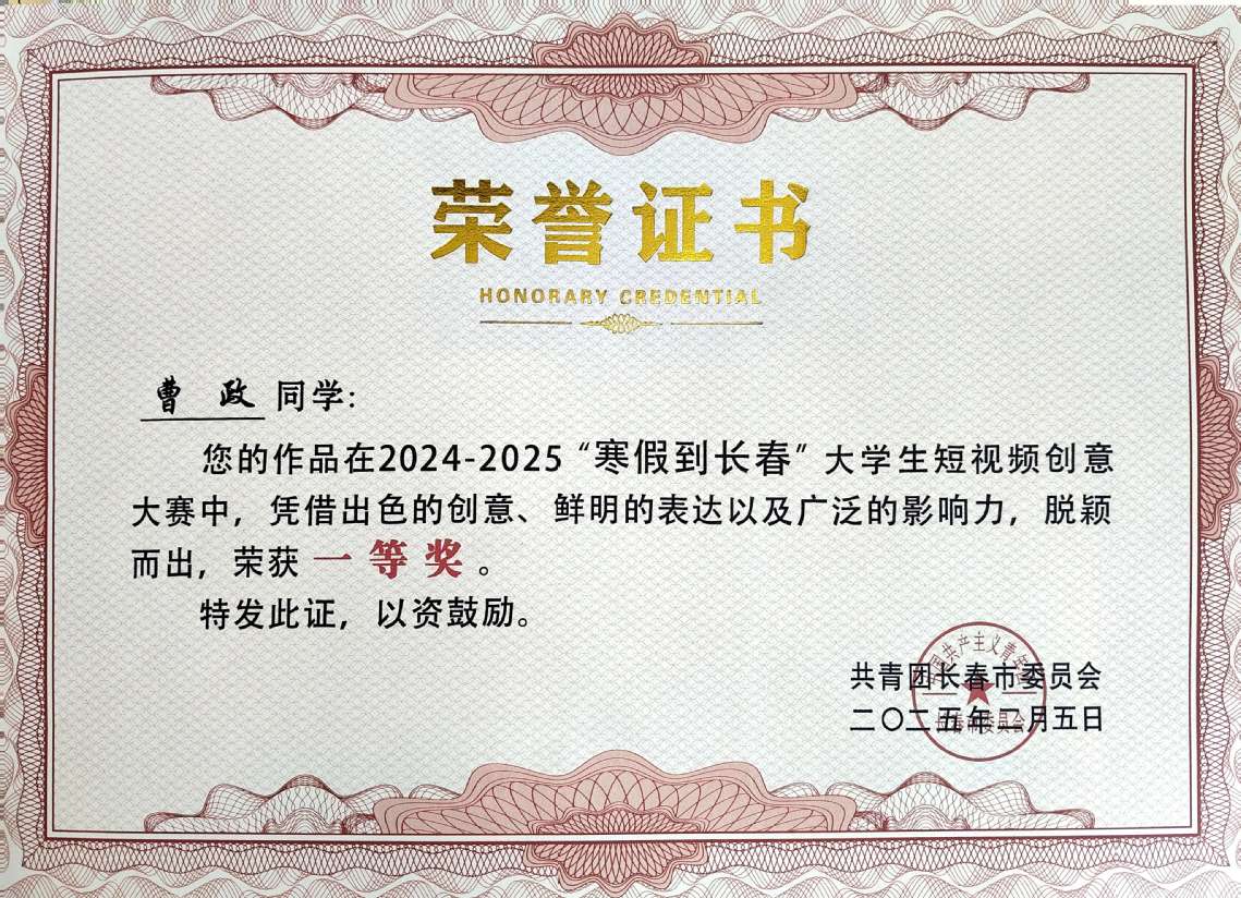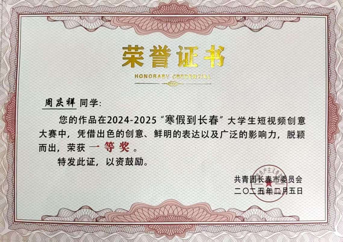 近日,由共青团长春市委员会主办、长春市文化广播电视和旅游局协办的“寒假到长春”大学生短视频创意大赛获奖名单公布,我校学生团队(王灿、周庆祥、曹政、曹耀辉)的参赛作品凭借独特的创意视角与精湛的表现手法获得大赛一等奖。