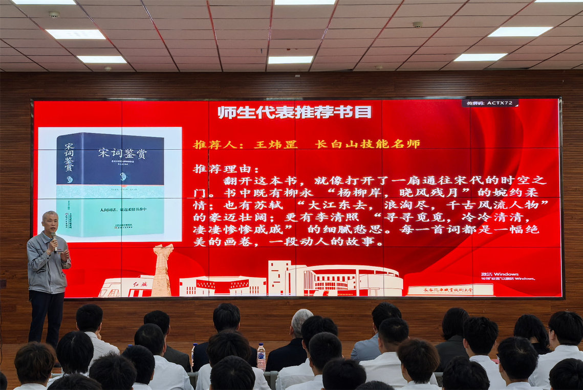 在荐书环节,党总支书记潘孝春、长白山技能名师王炜罡、教授王秀玲、专业负责人肖冰、博士张秋实和优秀学生代表付耀文为青马学员推荐书目,构建起兼具思想引领与人文素养的阅读书单,为青年学子搭建起多维成长的阅读阶梯。