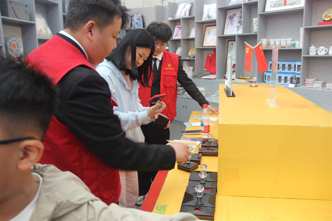 参观结束后,青马学员迅速转换身份,化身志愿者投身前台接待、社教辅助等工作。他们在前台耐心解答游客咨询、引导参观;在纪念册盖章处动作利落,为游客留存纪念印记;在社教活动区协助开展课程,手把手教小朋友绘画剪纸,现场氛围热烈温馨。活动尾声,学员们主动清扫场地,让展厅恢复整洁。
