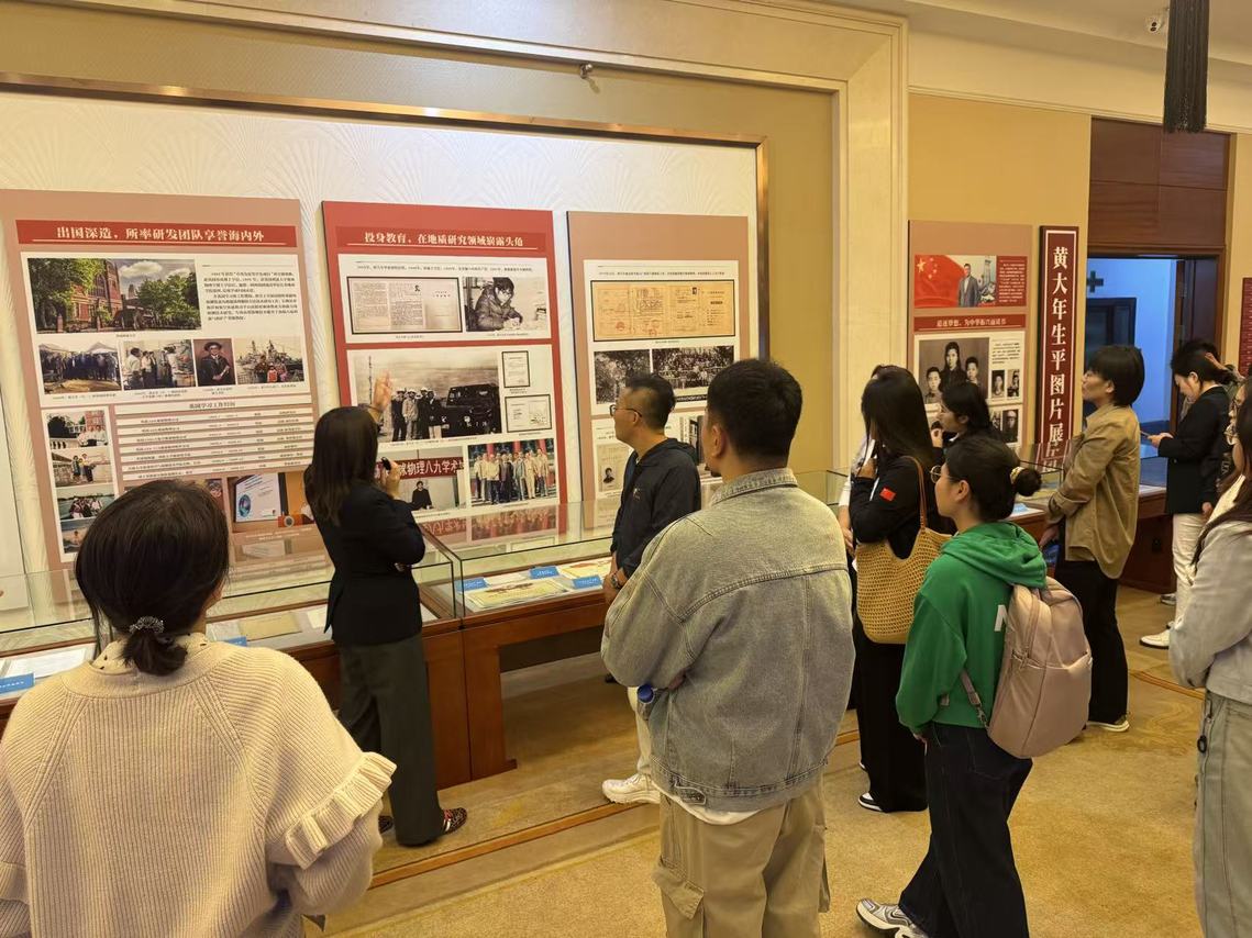 在讲解员的引导下,新入职教师悉心观览每一张照片、每一段影像,认真聆听黄大年教授的先进事迹,循着他的人生足迹,深刻领会其毕生深耕学术的执着坚守、胸怀家国的赤子情怀与倾己所能的无私奉献。馆内陈列的一幅幅照片、一件件实物,仿佛重现往昔奋斗岁月,深深触动在场每一位教师,引发强烈的敬佩与共鸣。