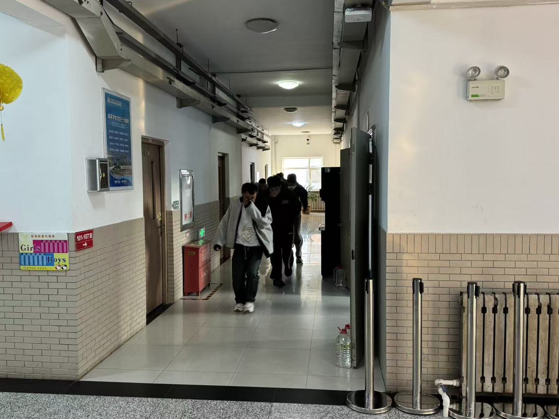 下午1时30分,演练正式开始。公寓内烟雾报警器响起,公寓管理员第一时间通过广播发布火情警报,引导学生有序疏散。在工作人员调度与引导下,学生们用湿毛巾捂住口鼻,沿着墙壁弯腰快速通过楼梯间,按照预定疏散路线有序撤离。疏散过程秩序井然,无拥挤、推搡现象,参与学生仅用3分20秒便全部撤离至公寓外指定安全区域,演练达到预期效果。