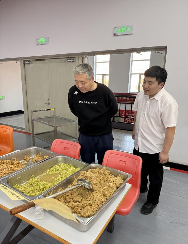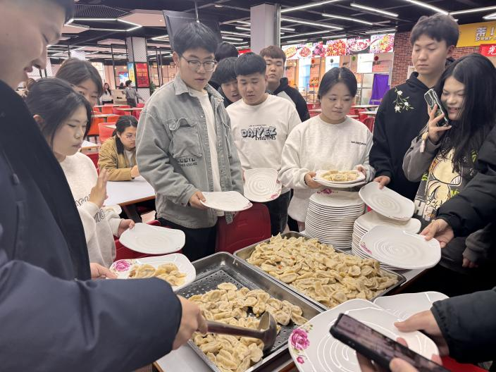 此次活动不仅是文化传承的舞台,更是拉进食堂与学生之间的“情感桥梁”。食堂工作人员穿梭在人群中,主动递面皮、教技法,和同学们唠着家常;学生们也纷纷把包好的饺子送到食堂阿姨手中,邀请她们一起品尝,双向的温暖互动让校园充满人情味。