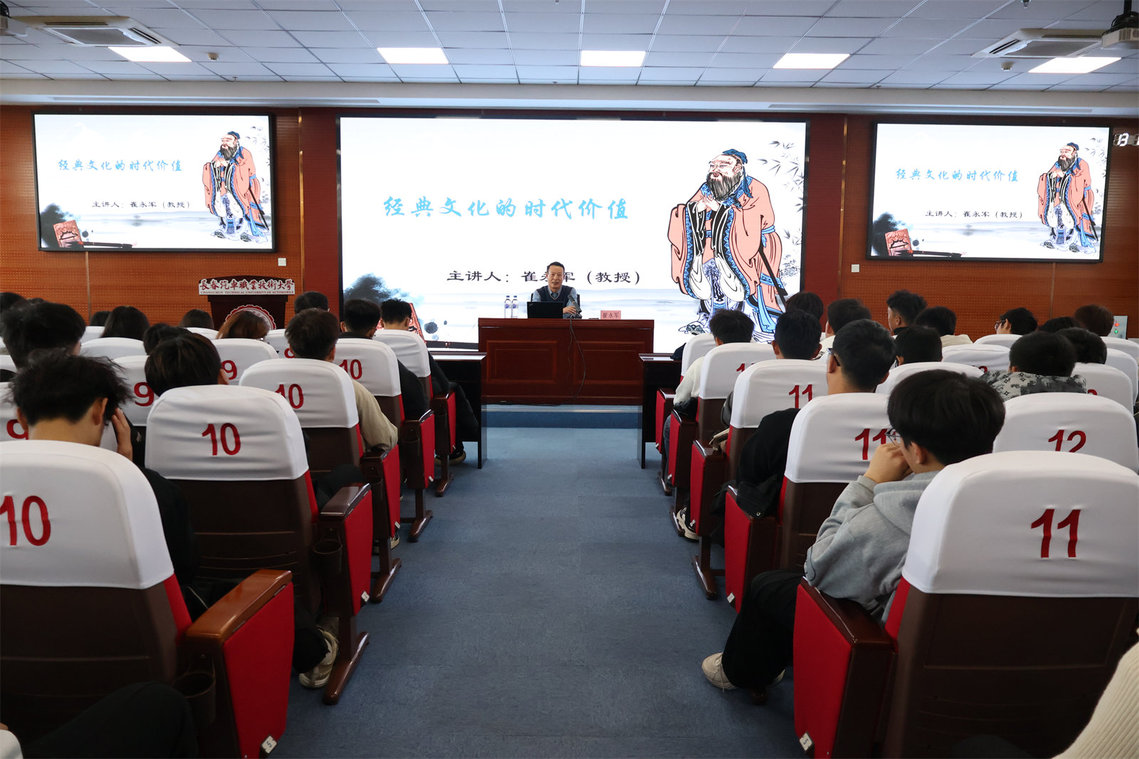 崔永军教授凭借深厚的学术积淀和生动的讲解风格,为师生们呈现了一场兼具思想深度与实践高度的文化盛宴。讲座开篇,崔教授明确指出,经典文化是民族的灵魂与社会的精神给养,是文明发展的根基与创新的土壤,阐明了尊重、弘扬、创新经典的时代意义。随后,他从《道德经》的自然智慧、《论语》的修身之道,到《史记》的历史启示、孟子的“浩然之气”,再到阳明心学的“知行合一”,系统梳理了经典文化的核心脉络,通过“仁义礼智信”“温良恭俭让”等经典理念与古今案例的结合,让传统智慧变得可感可知。
