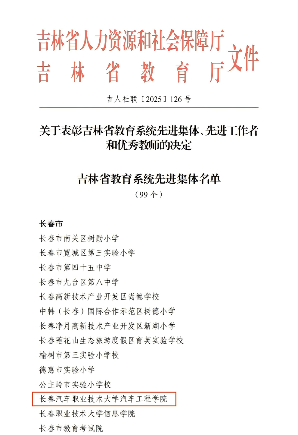 近日,吉林省人力资源和社会保障厅、吉林省教育厅联合印发《关于表彰吉林省教育系统先进集体、先进工作者和优秀教师的决定》,我校汽车工程学院荣获“吉林省教育系统先进集体”荣誉称号。