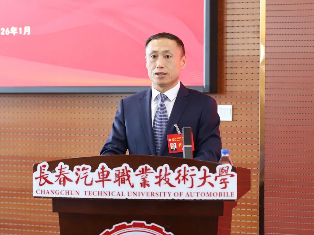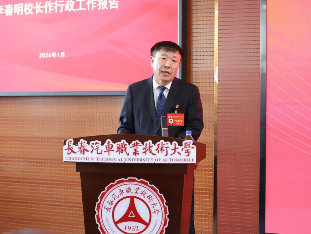 李春明校长向大会作行政工作报告。他指出,过去五年,学校主动服务汽车产业全生态,创新构建红旗工匠育人体系,涌现出杨永修、赵达等一大批新时代大国工匠,推动学校跃升成为全国第一所汽车职业本科院校,连续两轮跻身成为吉林省唯一国家“双高计划”学校建设单位,成为区域职业教育改革发展的标杆。李春明强调,“十五五”期间学校将紧扣职业教育高质量发展主线,持续深化与中国一汽共建共管共享的办学模式,聚焦汽车产业电动化、智能化、网联化转型趋势,全力实施“十强工程”,着力破解发展瓶颈,强化核心竞争力,推动职业本科教育向更深层次、更高质量发展,为加快建设行业性、开放式、创新型中国特色世界一流职业本科大学奠定坚实基础,为服务国家汽车产业战略、助力吉林全面振兴全方位振兴贡献更大力量。