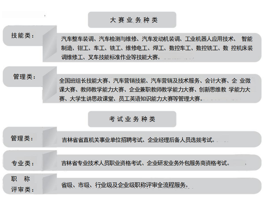 长春汽车职业技术大学具有丰富的专项大赛及考试资源,整合校企资源、建立前沿竞赛场地、选聘优质考评师资、规范竞赛及考试流程、优化赛事服务,为省市各级政府、省市工会、各行业协会以及企业提供专业的赛事服务。