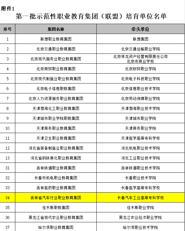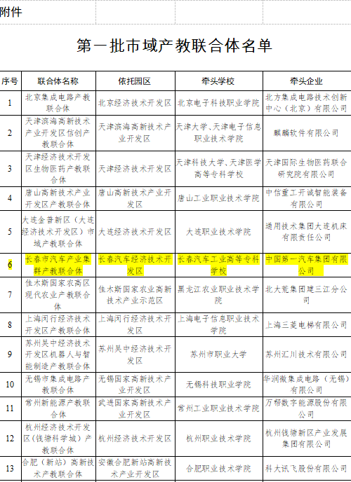长春汽车职业技术大学联合中国第一汽车集团有限公司、长春汽车经济技术开发区作为负责单位,共同牵头成立长春市汽车产业集群市域产教联合体。联合体成员涵盖了10个政府机构、8所本科院校、8所高职学校、38所中职学校、6所科研机构、近120家企业,是长春市组建的第一个市域产教联合体,成为教育部首批28个国家级市域产教联合体之一。
