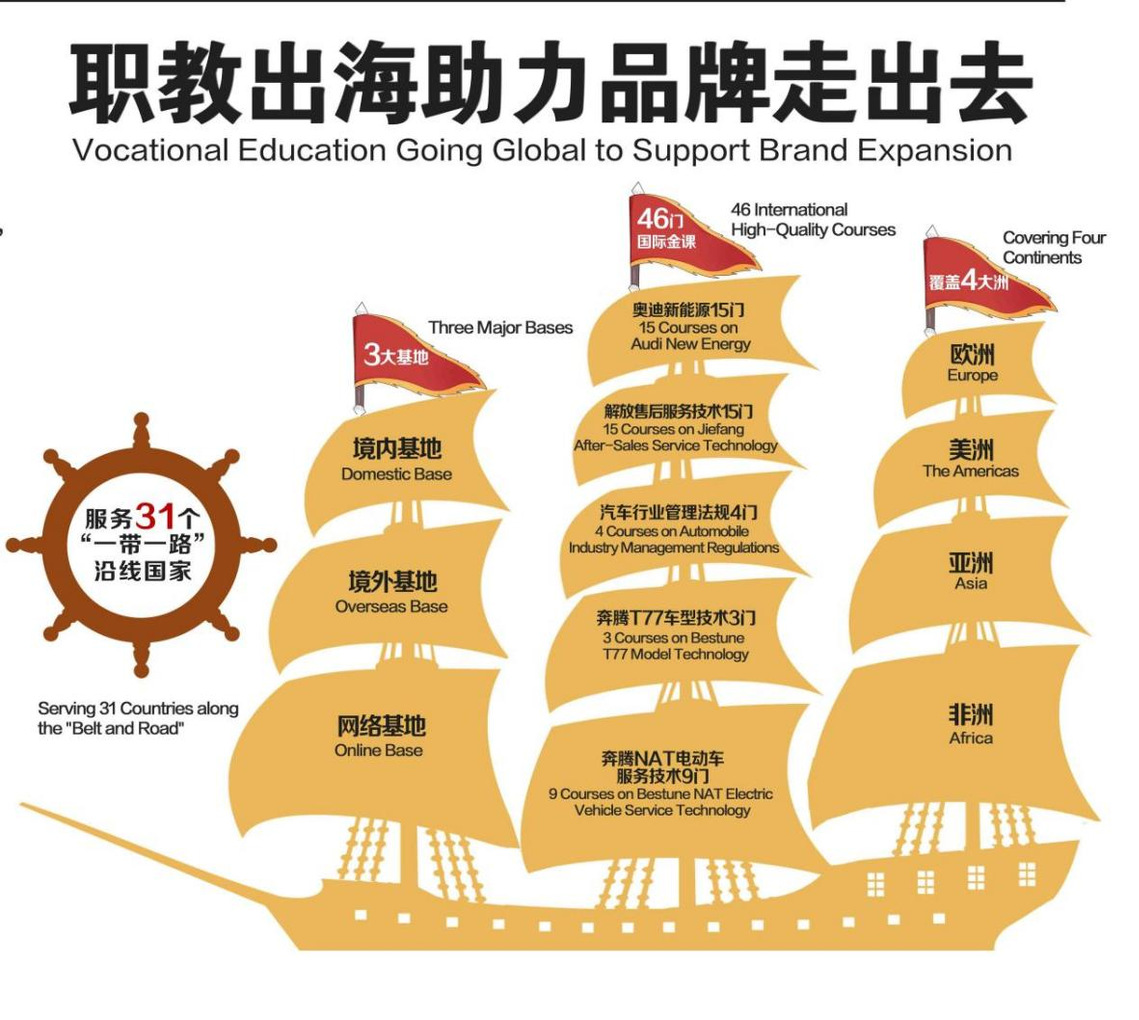 学校坚持教随产出、校企同行,开展海外汽车技术技能培训,服务自主汽车企业“走出去”,打造具有中国特色的“职教出海”品牌。与中国第一汽车集团签订《中国一汽海外事业人才培训培养基地共建协议》,约定在师资队伍建设、课程建设、评价认证标准建设、基地建设、网络培训平台建设、文化体系建设“六个维度”构建中国特色职业教育培训培养生态系统。先后建立了1个国内、2个海外“中国汽车品牌海外人才培养培训基地”,建成一套具有自主知识产权的“红旗工匠”培养培训体系,提供“红旗工匠”人才培训标准,开发红旗、奥迪、解放等品牌国际金课46门、课程资源119个,服务“一带一路”沿线国家31个,开展培训6000多人日,推动中国职业教育服务并融入国际产能合作,助力中国自主汽车品牌走向世界。