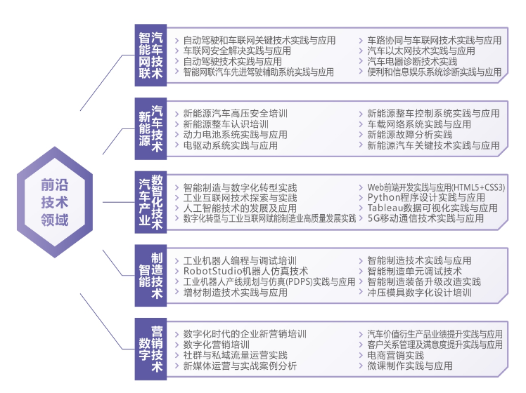 长春汽车职业技术大学作为吉林省新装备工匠学院、长春市汽车工匠学院、中国一汽技术技能人才培训培养基地,始终致力于中国汽车行业员工培训和人才培养,搭建“全生命周期”成长赋能和服务平台,精准提升培训服务质量,营造产业工人成长与作用发挥的良好生态环境,推动产业工人队伍综合素质提高。利用学校师资、场地、设备等优质资源,为企业定制化开发人才培养项目,与企业在人才培养、师资共建、科研转化等方向开展深度合作,持续为企业高技能人才搭建技术创新、成果展示、交流转化平台,助力企业实现项目成果有效转化。